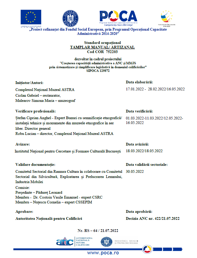 Standardul ocupațional al cursului de Tâmplar manual/artizanal, Cod COR 752203, a fost dezvoltat în cadrul proiectului ”Creșterea capacității administrative a ANC și MMJS prin sistematizare și simplificare legislativă în domeniul calificărilor”, SIPOCA 129872.